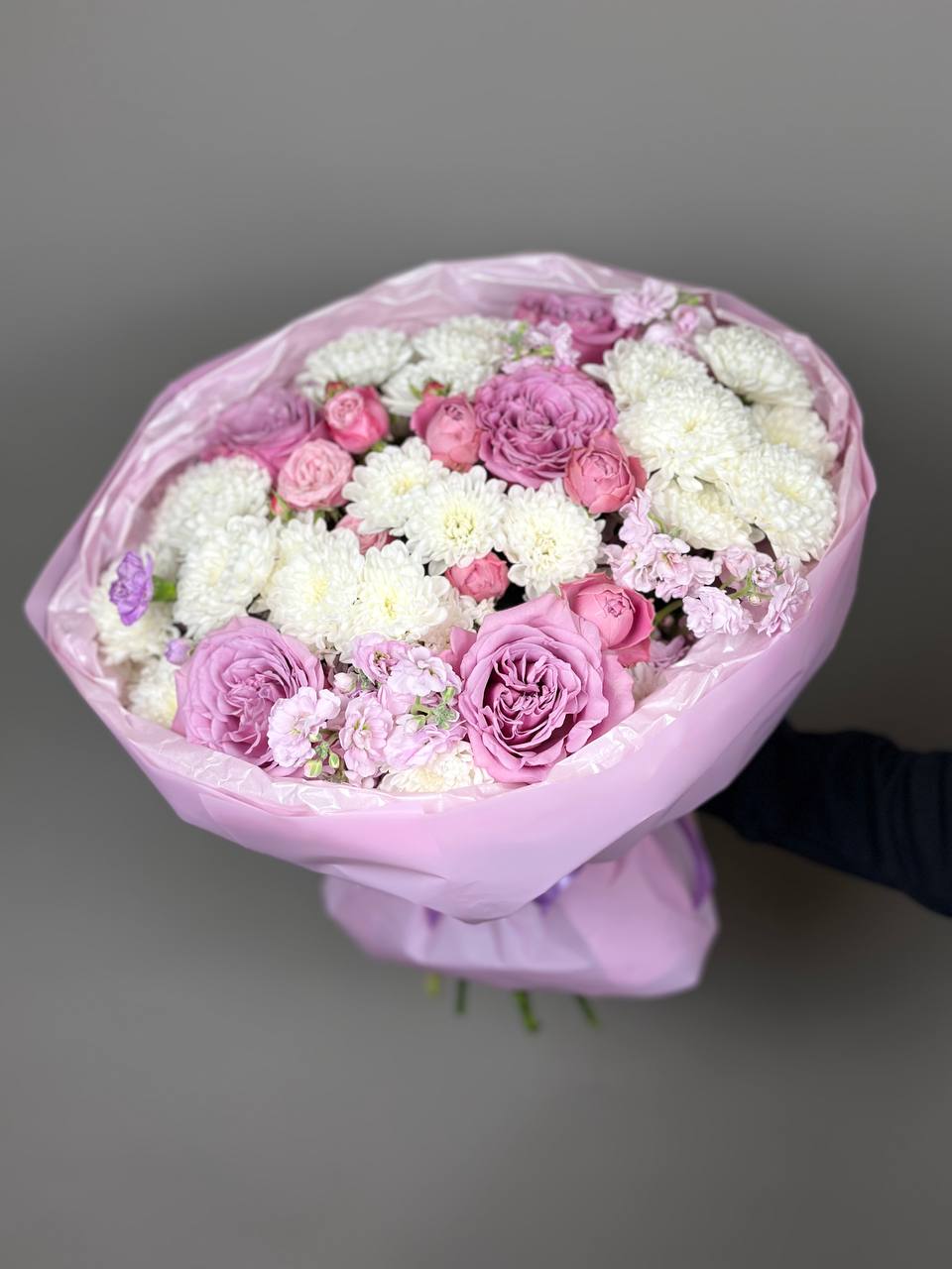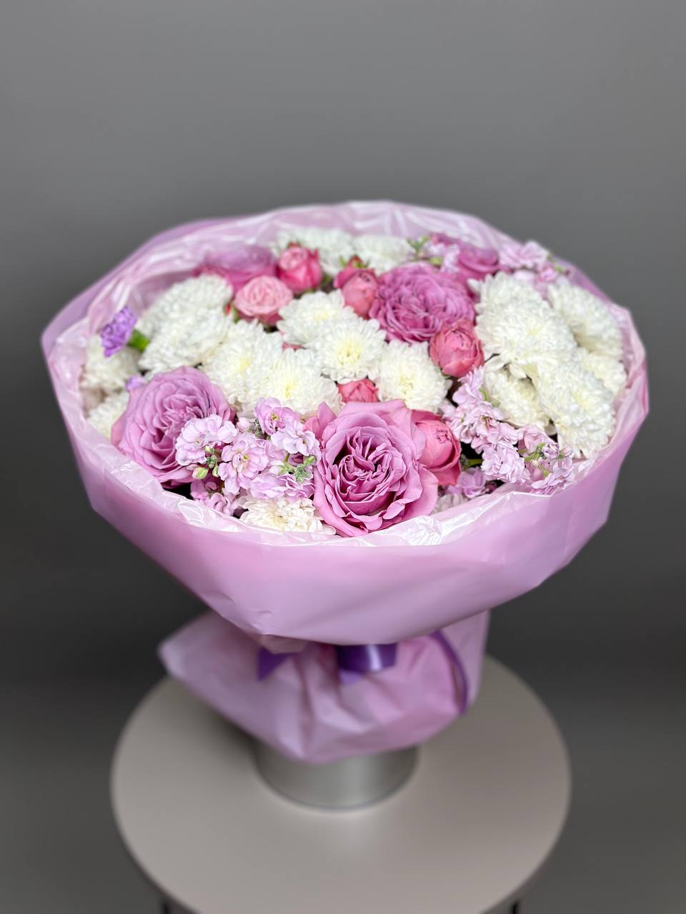 Букет из хризантем и пионовидных роз “Сиреневый”
